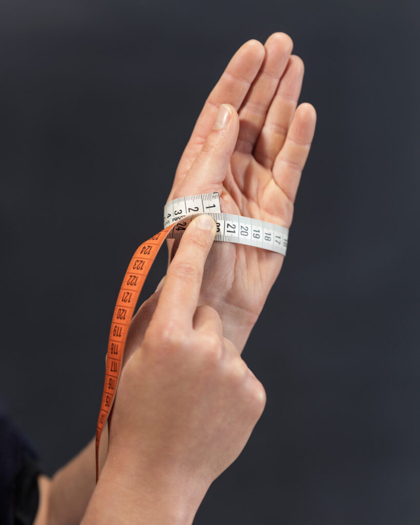 Alle Armreifen, GAIA und REHA, sind in drei Grössen erhältlich. Der Umfang wird wie im Foto mit angelegtem Daumen gemessen.